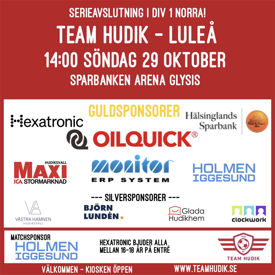 På söndag spelar IF Team Hudiks damlag sin sista match för säsongen. De har fortfarande chans att hålla sig kvar i div 1, så allt lever in i det sista. Team Hudik har fri entré och välkomnar alla Strandare till matchen. Vi hoppas på storpublik då och att ni vill vara med på läktaren. För motståndet står Luleå DFF och matchen startar kl.14:00 .